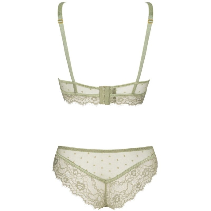 The lingerie set is a lace work of art. The bra is not stiffened and is additionally equipped with two straps on the neckline, so when peeking out from under a shirt or blouse, it will certainly attract great attention. The bra supports the bust well, which means that women with larger breasts will also be able to wear it. Tempting underwear in off-green color also includes comfortable and at the same time sensual lace panties, which, even though they are slightly more built, still create a sexy atmosphere. The design of the panties perfectly highlights women's buttocks, making every woman feel special. The set is perfect for everyday wear as well as for slightly more special moments.